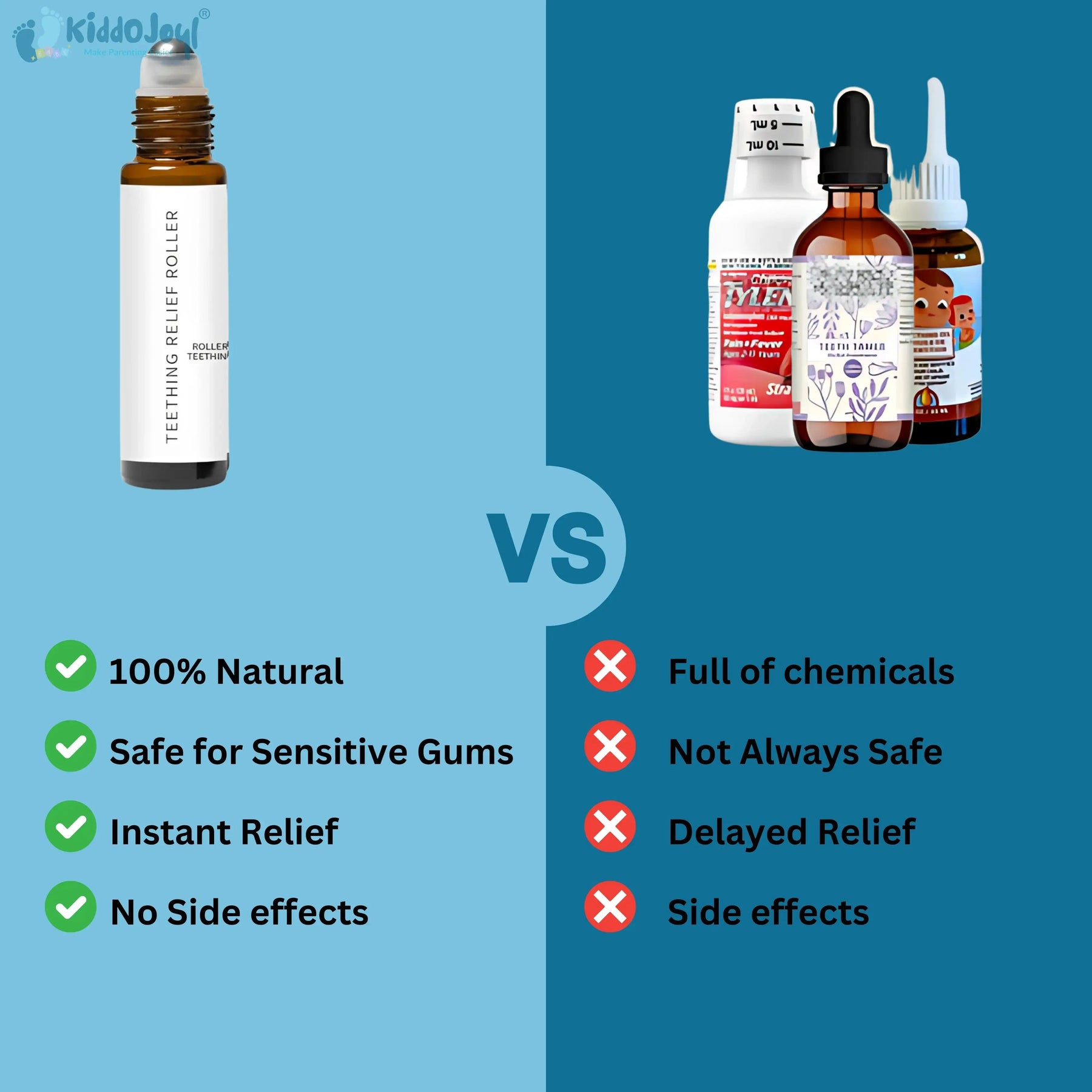 Gels and teething toys only provide short-term relief, and many contain harsh chemicals that parents prefer to avoid. The Teething Relief Roller is a gentle, all-natural oil blend that instantly soothes your baby’s gums without any mess. Just roll it on and watch your baby feel calmer within seconds.