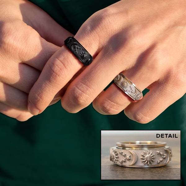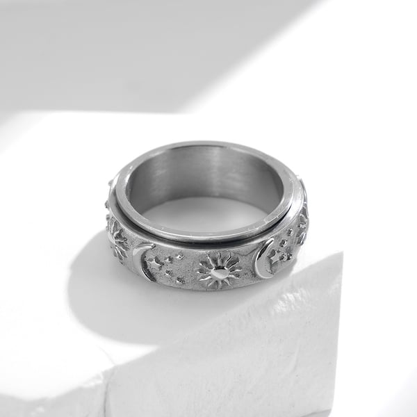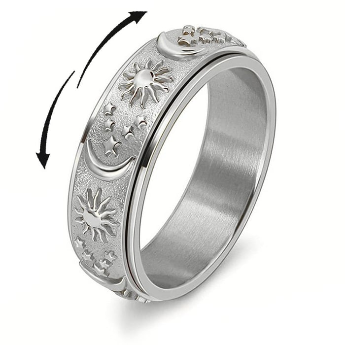 Design: Outer band with Sun, Moon, and Stars motif spins freely around the inner band.