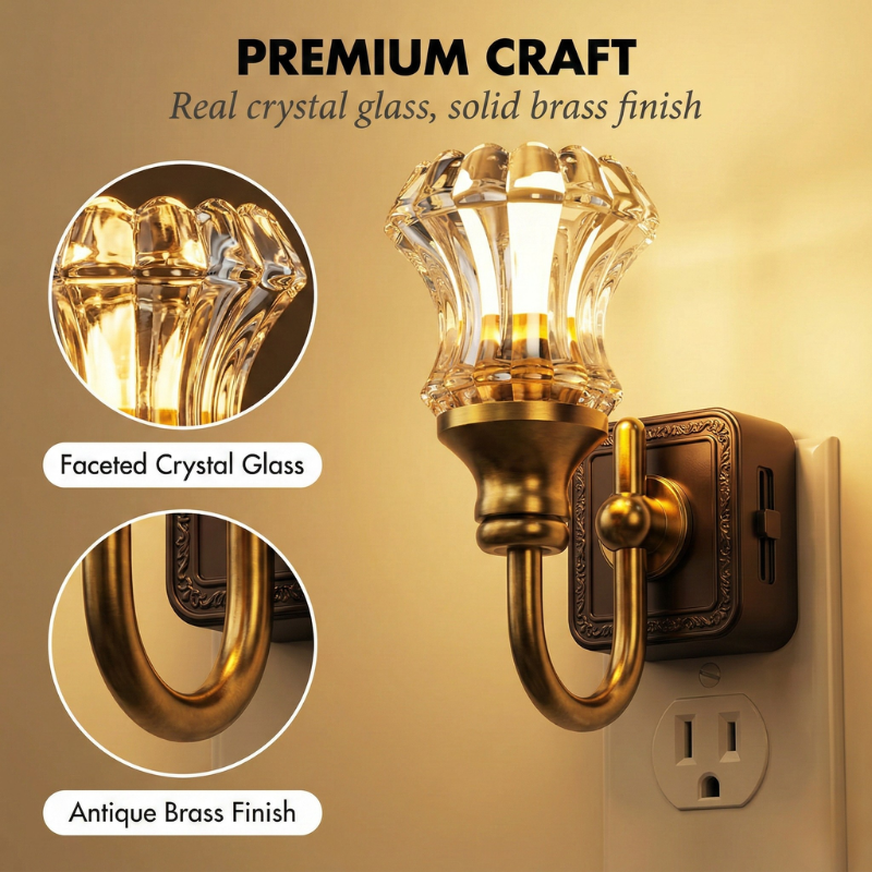 Patina™'s faceted crystal glass catches and softens the warm LED glow, casting a gentle amber light that transforms dark hallways, bathrooms, and bedrooms into spaces that feel calm, elegant, and intentional — with nothing more than plugging it into the wall.