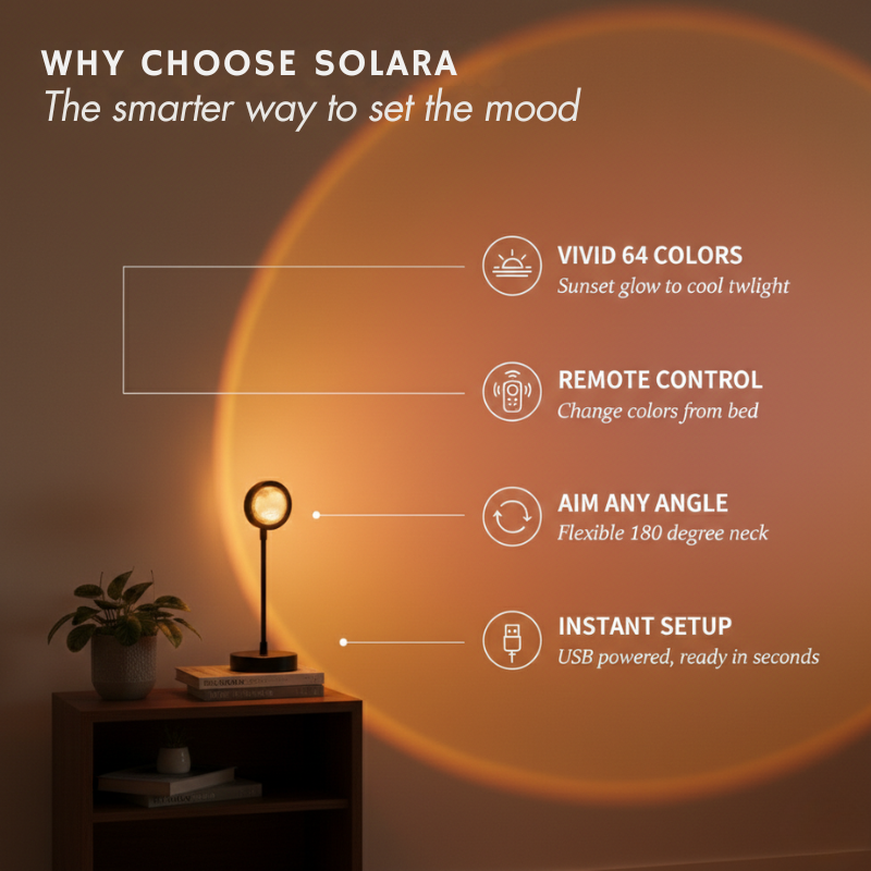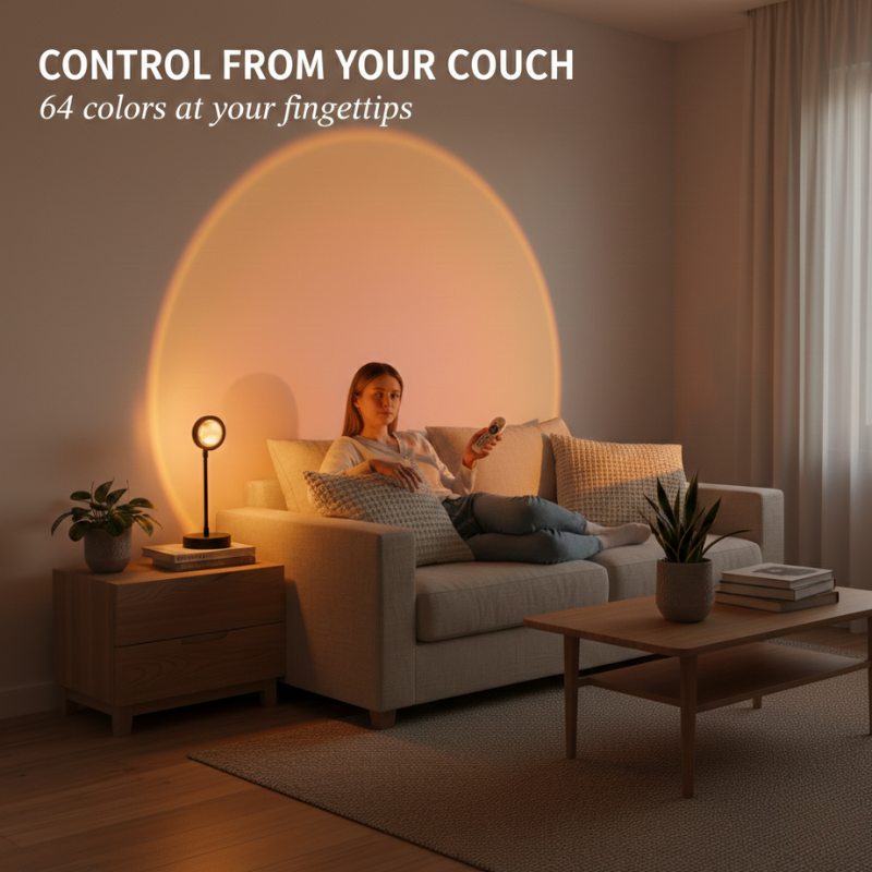 Most rooms are stuck with the same flat, lifeless lighting night after night — and no matter how nice your furniture or decor, the space just never feels quite right. The Solara™ Sunset Projector Lamp changes that with 64 colors of rich, gradient light that sweep across your wall like a real sunset.