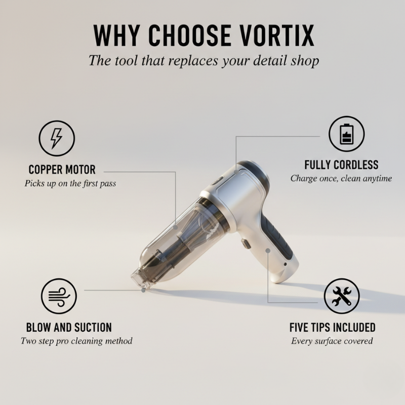 ✔ BLOW + VACUUM: THE TWO-STEP CLEAN THAT PROFESSIONALS USE - Detailers don’t just vacuum—they blow debris loose first, then suction it away. The Vortix™ dual-action system puts that same professional technique in your hands for a fraction of the cost.