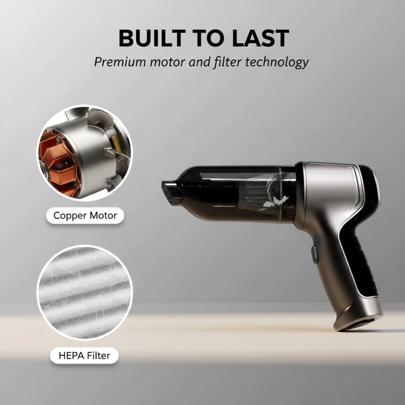 The brushless motor spins at high RPM to generate industrial-grade suction in a body compact enough to fit in your cupholder—so the excuse “it’s too much hassle” no longer exists.