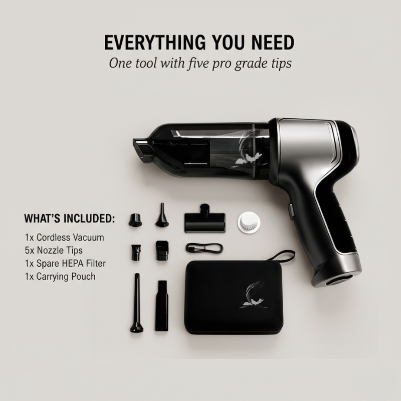 The Vortix™ is the first cordless car vacuum built with a dual-action blow-and-suction system—powered by a brushless copper motor that blasts embedded debris out of vents and seams, then vacuums it up in a single pass.