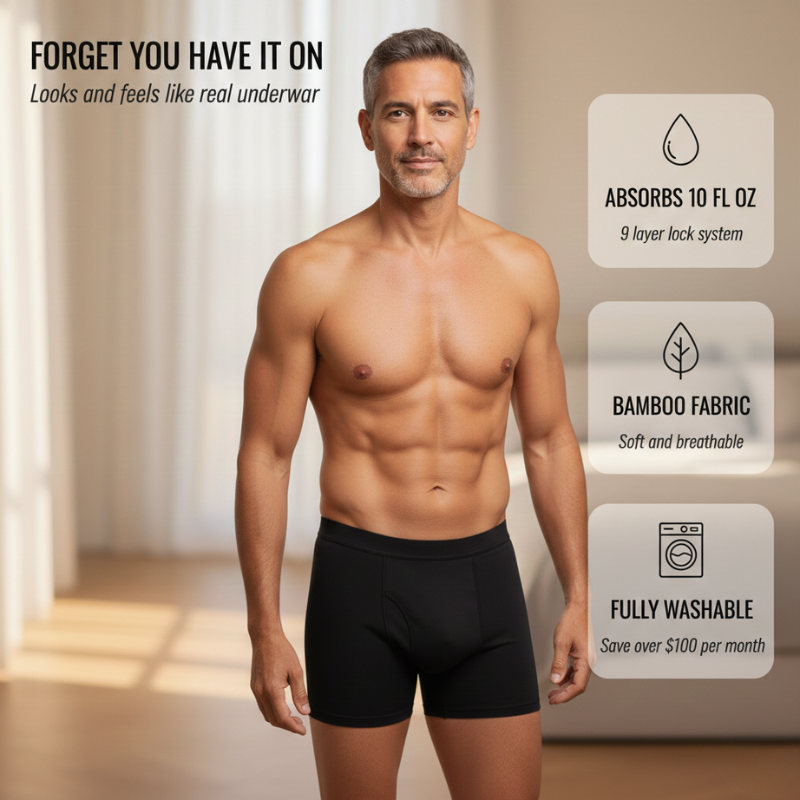 A 9-layer MultiVault absorption system — engineered to catch, absorb, and lock away up to 10 fl oz of fluid — hidden inside boxer briefs that look, fit, and feel exactly like the underwear you've always worn. No bulk. No bunching. No one knows but you. Just pull them on in the morning, and go live your day — the way you used to, before any of this started.