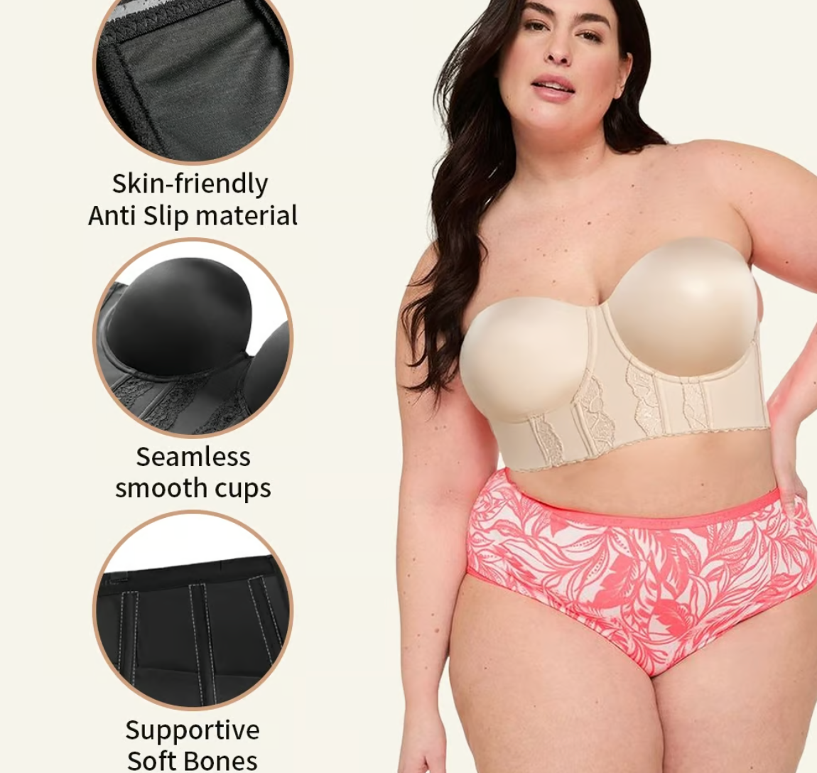 • Features: Ultra-low back, strapless, seamless bonded edges for invisibility, breathable and moisture-wicking fabric, advanced no-slip Silicone Grip Edging, flexible shaping panels, extended wear comfort.