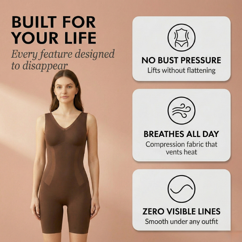 The problem was never your body. It was that every shapewear piece you've tried either flattened what you wanted lifted, dug in where it shouldn't, or came off before noon — until the Sliven™ Seamless Sculpting Bodysuit rebuilt the category from the inside out with a breathable compression architecture that holds your waist, frees your bust, and disappears under anything.