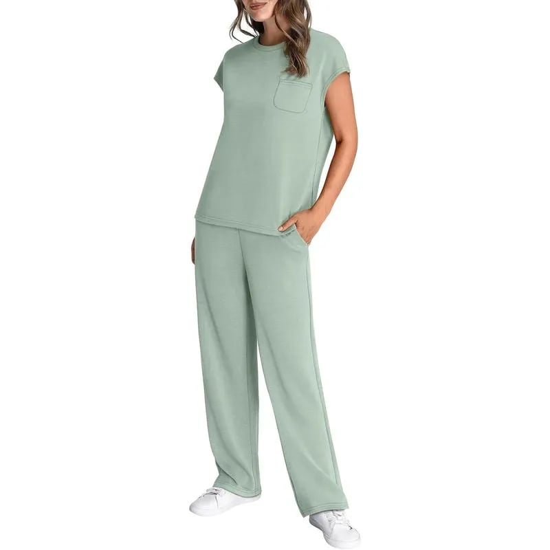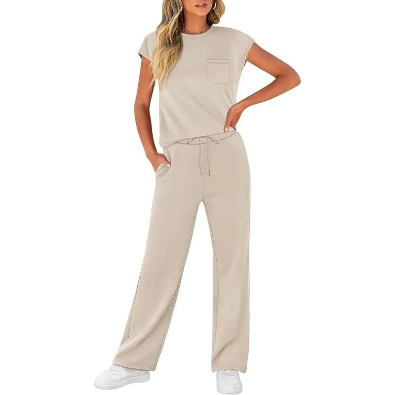 • Design: 2-Piece Set with Cap Sleeve Top and Wide Leg Pants.